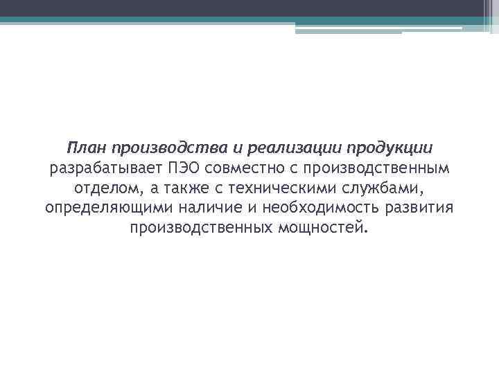 План производства и реализации продукции разрабатывает ПЭО совместно с производственным отделом, а также с техническими службами, определяющими наличие и необходимость развития производственных мощностей.