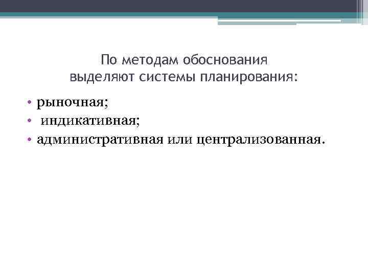 По методам обоснования выделяют системы планирования: • рыночная; • индикативная; • административная или централизованная.