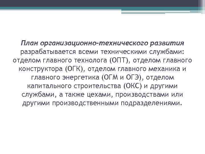 План организационно-технического развития разрабатывается всеми техническими службами: отделом главного технолога (ОПТ), отделом главного конструктора (ОГК), отделом главного механика и главного энергетика (ОГМ и ОГЭ), отделом капитального строительства (ОКС) и другими службами, а также цехами, производствами или другими производственными подразделениями.