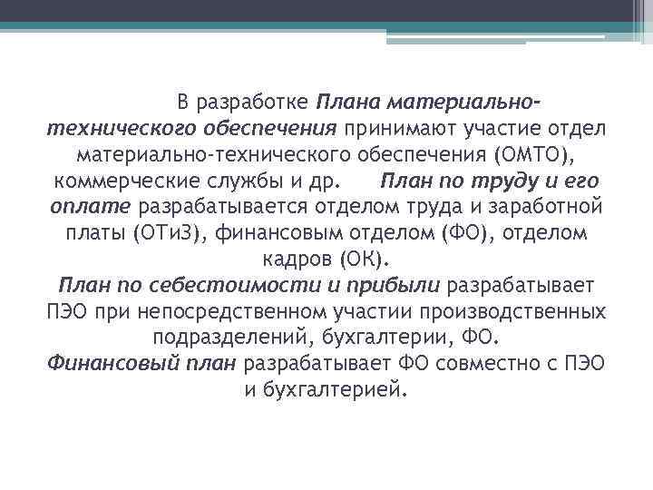 В разработке Плана материальнотехнического обеспечения принимают участие отдел материально-технического обеспечения (ОМТО), коммерческие службы и др. План по труду и его оплате разрабатывается отделом труда и заработной платы (ОТи. З), финансовым отделом (ФО), отделом кадров (ОК). План по себестоимости и прибыли разрабатывает ПЭО при непосредственном участии производственных подразделений, бухгалтерии, ФО. Финансовый план разрабатывает ФО совместно с ПЭО и бухгалтерией.