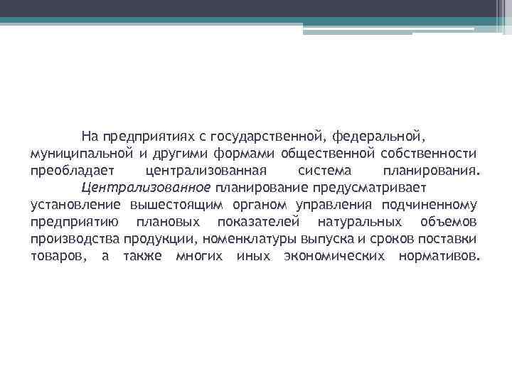 На предприятиях с государственной, федеральной, муниципальной и другими формами общественной собственности преобладает централизованная система планирования. Централизованное планирование предусматривает установление вышестоящим органом управления подчиненному предприятию плановых показателей натуральных объемов производства продукции, номенклатуры выпуска и сроков поставки товаров, а также многих иных экономических нормативов.