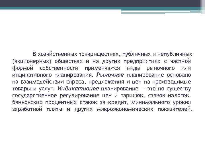 В хозяйственных товариществах, публичных и непубличных (акционерных) обществах и на других предприятиях с частной формой собственности применяются виды рыночного или индикативного планирования. Рыночное планирование основано на взаимодействии спроса, предложения и цен на производимые товары и услуг. Индикативное планирование — это по существу государственное регулирование цен и тарифов, ставок налогов, банковских процентных ставок за кредит, минимального уровня заработной платы и других макроэкономических показателей.