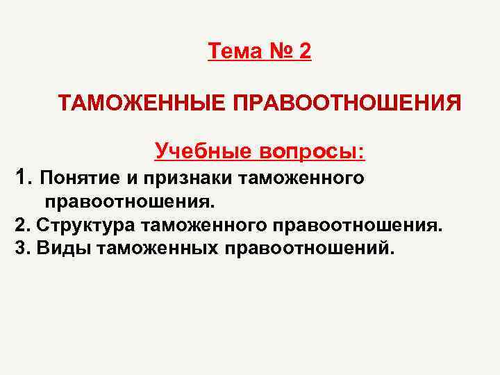 Тема № 2 ТАМОЖЕННЫЕ ПРАВООТНОШЕНИЯ Учебные вопросы: 1. Понятие и признаки таможенного правоотношения. 2. Структура таможенного правоотношения. 3. Виды таможенных правоотношений.