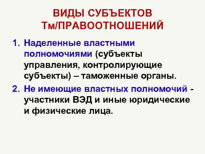 ВИДЫ СУБЪЕКТОВ Тм/ПРАВООТНОШЕНИЙ 1. Наделенные властными полномочиями (субъекты управления, контролирующие субъекты) – таможенные органы. 2. Не имеющие властных полномочий участники ВЭД и иные юридические и физические лица.