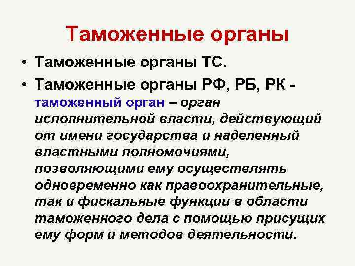 Таможенные органы • Таможенные органы ТС. • Таможенные органы РФ, РБ, РК таможенный орган – орган исполнительной власти, действующий от имени государства и наделенный властными полномочиями, позволяющими ему осуществлять одновременно как правоохранительные, так и фискальные функции в области таможенного дела с помощью присущих ему форм и методов деятельности.