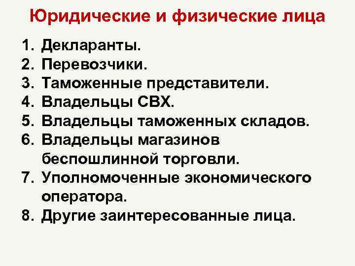 Юридические и физические лица 1. 2. 3. 4. 5. 6. Декларанты. Перевозчики. Таможенные представители. Владельцы СВХ. Владельцы таможенных складов. Владельцы магазинов беспошлинной торговли. 7. Уполномоченные экономического оператора. 8. Другие заинтересованные лица.