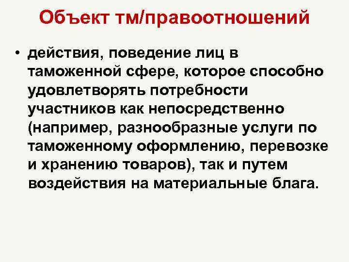 Объект тм/правоотношений • действия, поведение лиц в таможенной сфере, которое способно удовлетворять потребности участников как непосредственно (например, разнообразные услуги по таможенному оформлению, перевозке и хранению товаров), так и путем воздействия на материальные блага.