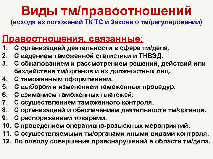 Виды тм/правоотношений (исходя из положений ТК ТС и Закона о тм/регулировании) Правоотношения, связанные: 1. С организацией деятельности в сфере тм/дела. 2. С ведением таможенной статистики и ТНВЭД. 3. С обжалованием и рассмотрением решений, действий или бездействия тм/органов и их должностных лиц. 4. С таможенным оформлением. 5. С выбором и изменением таможенных процедур. 6. С взиманием таможенных платежей. 7. С осуществлением таможенного контроля. 8. С организацией и обеспечением деятельности тм/органов. 9. С распоряжением товарами. 10. С проведением оперативно-розыскных мероприятий. 11. С осуществляемыми тм/органами иными видами контроля. 12. По поводу совершения правонарушений в области тм/дела.