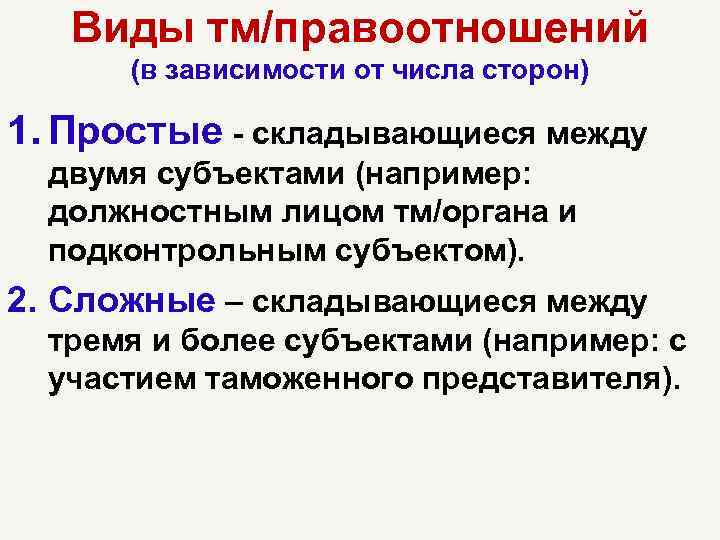Виды тм/правоотношений (в зависимости от числа сторон) 1. Простые - складывающиеся между двумя субъектами (например: должностным лицом тм/органа и подконтрольным субъектом). 2. Сложные – складывающиеся между тремя и более субъектами (например: с участием таможенного представителя).