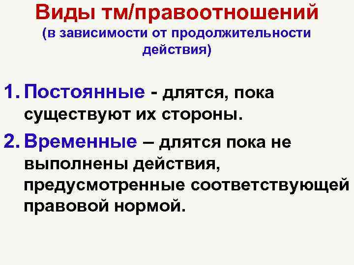 Виды тм/правоотношений (в зависимости от продолжительности действия) 1. Постоянные - длятся, пока существуют их стороны. 2. Временные – длятся пока не выполнены действия, предусмотренные соответствующей правовой нормой.