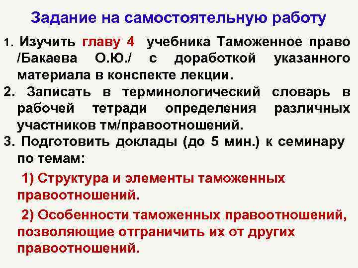 Задание на самостоятельную работу 1. Изучить главу 4 учебника Таможенное право /Бакаева О. Ю. / с доработкой указанного материала в конспекте лекции. 2. Записать в терминологический словарь в рабочей тетради определения различных участников тм/правоотношений. 3. Подготовить доклады (до 5 мин. ) к семинару по темам: 1) Структура и элементы таможенных правоотношений. 2) Особенности таможенных правоотношений, позволяющие отграничить их от других правоотношений.