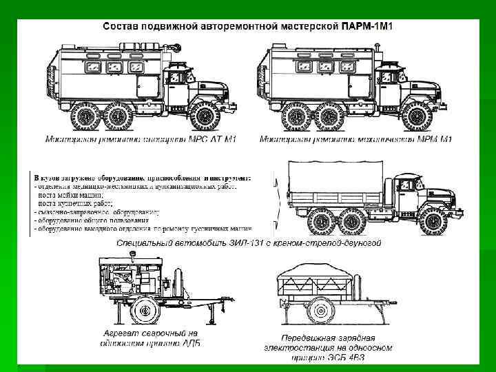 • • В состав ПАРМ-1 М 1 входят: подвижные мастерские на АТ ЗИЛ-131, ремонтнослесарная мастерская МРС-АТ-М 1 и ремонтномеханическая мастерская МРМ-М 1; специальные установки, агрегат сварочный АДБ (6120) на одноосном прицепе 1 -П-2, 5 и передвижная зарядная электростанция мод. ЭСБ 4 -ВЗ-1 -М 1 на одноосном прицепе 1 -АП-1, 5; специальный АТ ЗИЛ-131 под выносное оборудование с тентом, лебедкой и кран-стрелойдвуногой; комплекты оборудования, приспособлений и инструмента (отделения медницко-жестяницких и вулканизационных работ; постов мойки машин, кузнечных работ и смазочно-заправочных работ; общего пользования и выездного отделения по ремонту гусеничных и четырехосных машин).