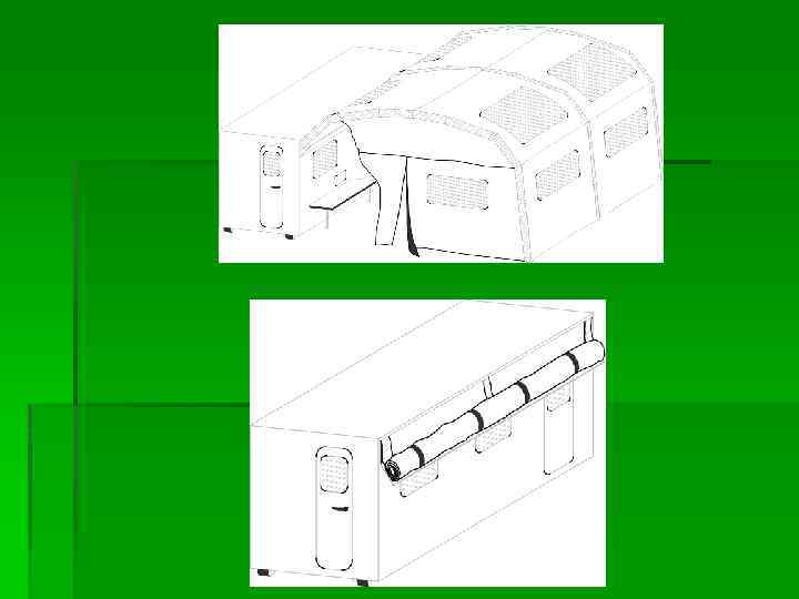 При развертывании в кузове мастерской организуются три рабочих места: слесаря, электрика и специалиста по приборам питания. Вне мастерской в палатке П-20, развертывается также три рабочих места: два - слесареймонтажников и одно – сварщика. Время развертывания (свертывания) мастерской с установкой крана-стрелы и палатки – 30 мин. Рисунок 3 - Общий вид палатки: 1 – каркас; 2 – верхний намет; 3 – левый намет; 4 – правый намет; 5 – растяжка; 6 – кол; 7 – приколыш