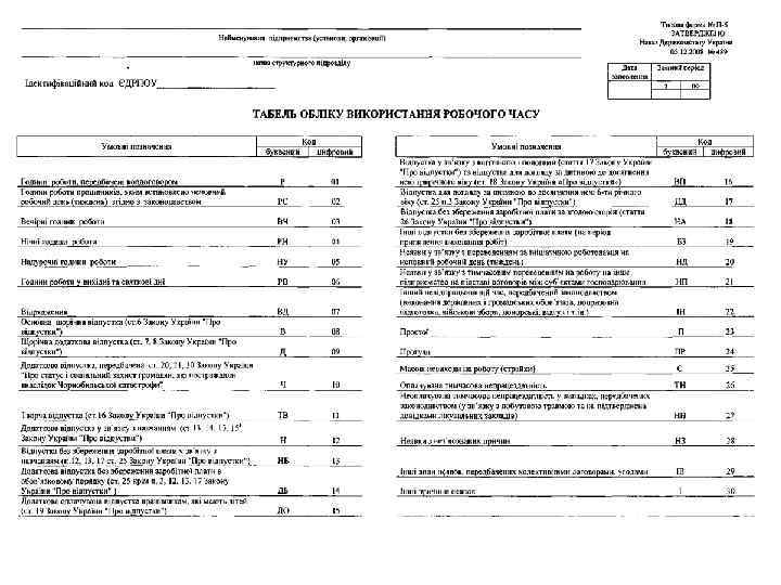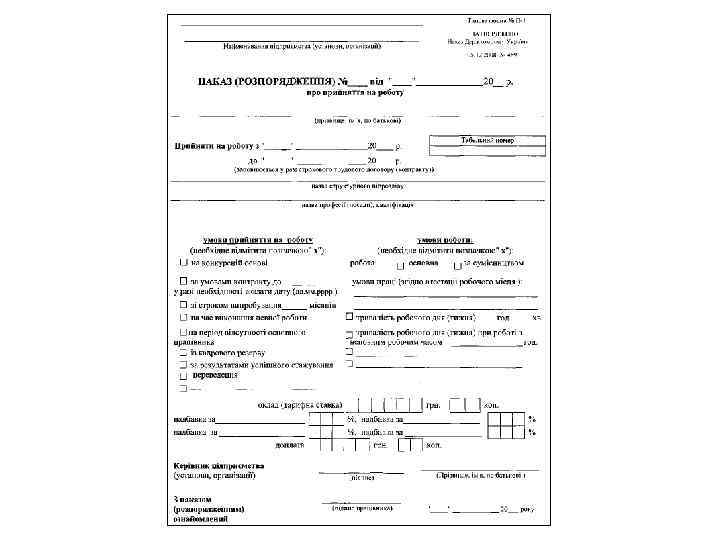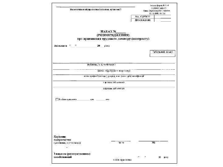 ДЕРЖАВНИЙ КОМІТЕТ СТАТИСТИКИ УКРАЇНИ (Держкомстат України) НАКАЗ 05. 12. 2008 Про затвердження типових форм первинної облікової документації зі статистики праці Київ № 489 Відповідно до статей 4, 18 Закону України "Про державну статистику", враховуючи положення статей 80, 81, 95 Цивільного кодексу України, частини восьмої статті 19 та статті 55 Господарського кодексу України, з метою подальшого вдосконалення державних статистичних спостережень підприємств, установ, організацій щодо обліку особового складу, використання робочого часу та розрахунків з працівниками із заробітної плати НАКАЗУЮ: 1. Затвердити та ввести в дію з 1 січня 2009 року типові форми первинної облікової документації підприємств, установ, організацій, що додаються: 1. 1. № П-1 "Наказ (розпорядження) про прийняття на роботу". 1. 2. № П-2 "Особова картка працівника". 1. 3. № П-3 "Наказ (розпорядження) про надання відпустки". 1. 4. № П-4 "Наказ (розпорядження) про припинення трудового договору (контракту)". 1. 5. № П-5 "Табель обліку використання робочого часу". 1. 6. № П-6 "Розрахунково-платіжна відомість працівника". 1. 7. № П-7 "Розрахунково-платіжна відомість (зведена)". 2. Департаменту статистики праці (Григорович Н. В. ): 2. 1. У тижневий строк надіслати головним управлінням статистики в Автономній Республіці Крим, областях, місті Києві та Управлінню статистики у місті Севастополі зразки типових форм первинної облікової документації, затверджених цим наказом. 2. 2. Здійснювати методологічне керівництво застосуванням типових форм первинної облікової документації, затверджених цим наказом, для проведення державних статистичних спостережень. 3. Начальникам головних управлінь статистики в Автономній Республіці Крим, областях, місті Києві та Управлінню статистики у місті Севастополі довести до відома респондентів інформацію щодо затвердження типових форм первинної облікової документації. 4. Визнати такими, що втратили чинність, з 1 січня 2009 року: 4. 1. Наказ Міністерства статистики України від 22 травня 1996 року № 144 "Про затвердження типових форм первинного обліку О. Г. Осауленко по розрахунках з робітниками і службовцями по заробітній платі". 4. 2. Наказ Міністерства статистики України від 9 жовтня 1995 року № 253 "Про затвердження типових форм первинного обліку". 4. 3. Наказ Міністерства статистики України від 27 жовтня 1995 року № 277 "Про затвердження типових форм первинного обліку особового складу " в частині затвердження типової форми первинного обліку № П-2 "Особова картка". 5. Контроль за виконанням цього наказу покласти на заступника Голови Власенко Н. С.