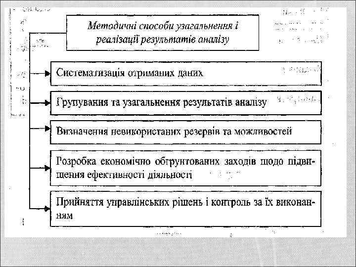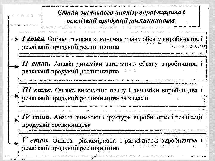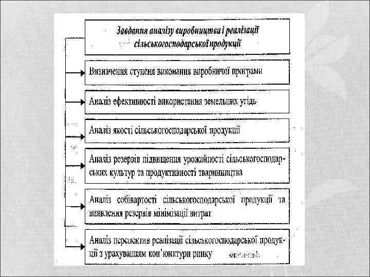 Завданнями аналізу виробництва продукції є: • 1. Оцінка виконання плану й динаміки виробництва. • 2. Оцінка оптимальності й напруженості плану. • 3. Виявлення й визначення основних факторів, що впливають на обсяги виробництва. • 4. Розкриття взаємозв'язку й взаємообумовленості • показників обсягу виробництва, реалізації, асортименту, • якості продукції. • 5. Виявлення внутрішніх резервів підприємства зі • збільшення випуску продукції. • 6. Розробка організаційно-технічних заходів щодо використання виявлених резервів.