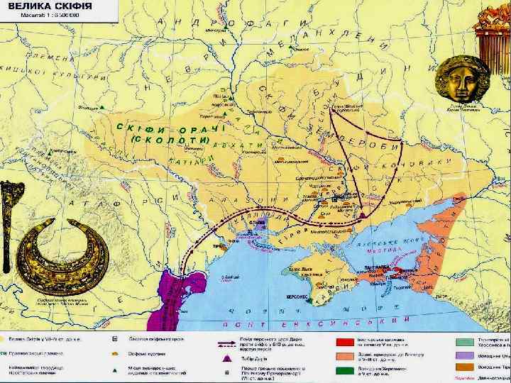 Скіфи VII-II ст. до н. е. Племена скотарів – кочівників з Ірану; ► Золоті вироби високої майстерності, прикладне мистецтво (анімалістичний стиль); ► зв’язки з античною Грецією, торгівля; ► Рабовласництво, держава; ► Пантеон богів на чолі з богинею вогню Табіті. Боги Папай (небо) та Апі (земля). ► Культові предмети: сокира, чаша, плуг, ярмо. ►