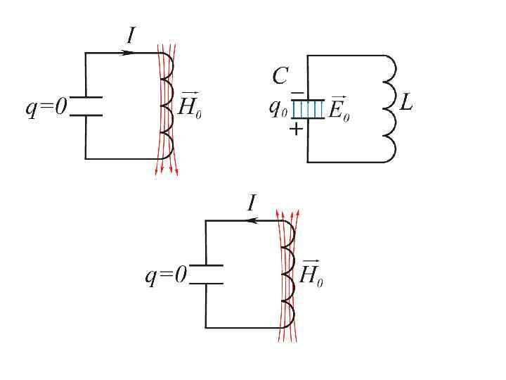 3. 1. Свободные незатухающие электрические колебания Колебательный контур – цепь, состоящая из конденсатора и катушки. Е –напряженность электрического поля; H – напряженность магнитного поля; q – заряд; С –емкость конденсатора; L – индуктивность катушки, I – cила тока в контуре
