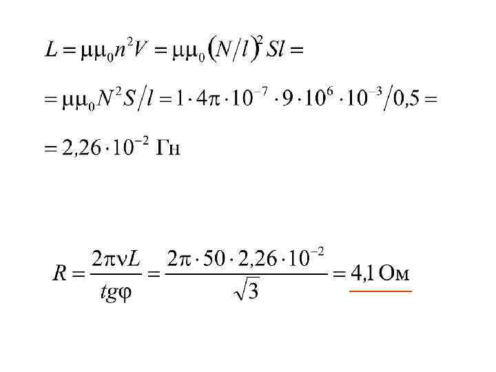 Задача 3. 3 Катушка длиной 50 см и площадью поперечного сечения 10 см 2 включена в цепь переменного тока с частотой 50 Гц. Число витков катушки 3000. Найти активное сопротивление катушки, если сдвиг фаз между током и напряжением 60º. Дано: l = 50 см = 0, 5 м S = 10 см 2 = 10 -3 м 2 ν = 50 Гц N = 3000 φ = 60º R-?