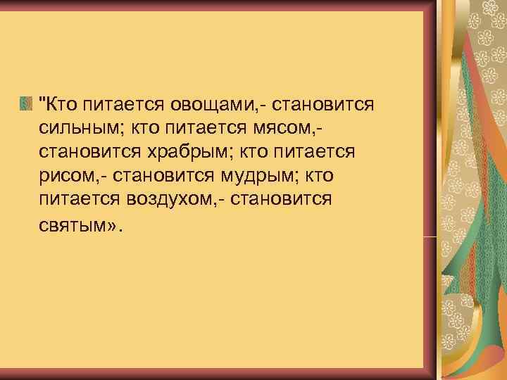 "Кто питается овощами, - становится сильным; кто питается мясом, - становится храбрым; кто питается рисом, - становится мудрым; кто питается воздухом, - становится святым» .