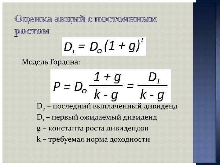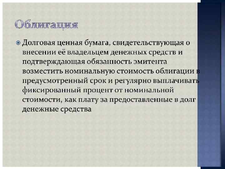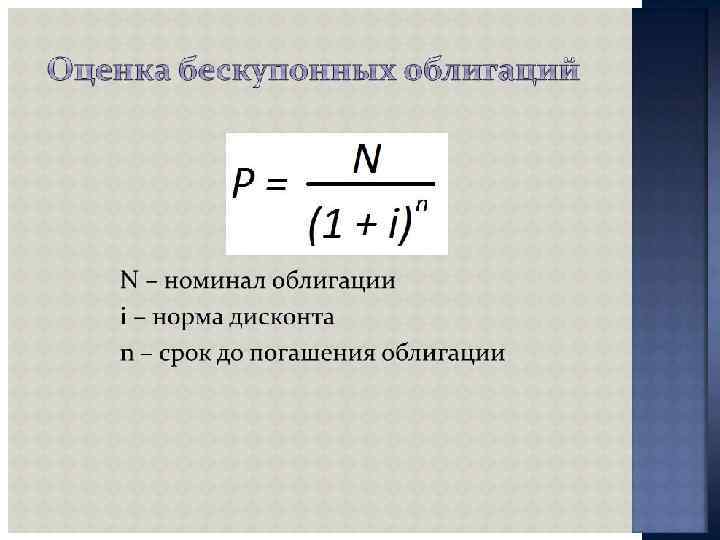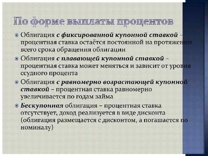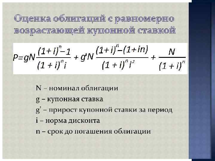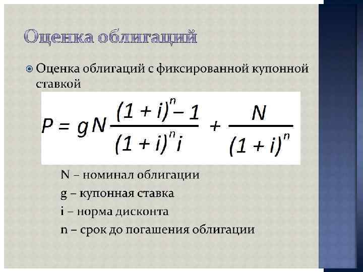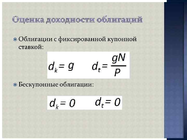ПОКАЗАТЕЛИ ДОХОДНОСТИ Облигации - Текущая доходность облигации = Годовой купонный доход / текущий рыночный курс облигации - Заявленная доходность облигации ={Купонный доход + [(Номинальная стоимость - текущий рыночный курс) / годы до конца срока]} / [(Номинальная цена + Текущий рыночный курс) / 2] - Реализованная доходность облигации = {[Купонный доход + [(Ожидаемый будущий курс - текущий рыночный курс) / Годы владения]} / [(Ожидаемый рыночный курс + Текущий рыночный курс) / 2]