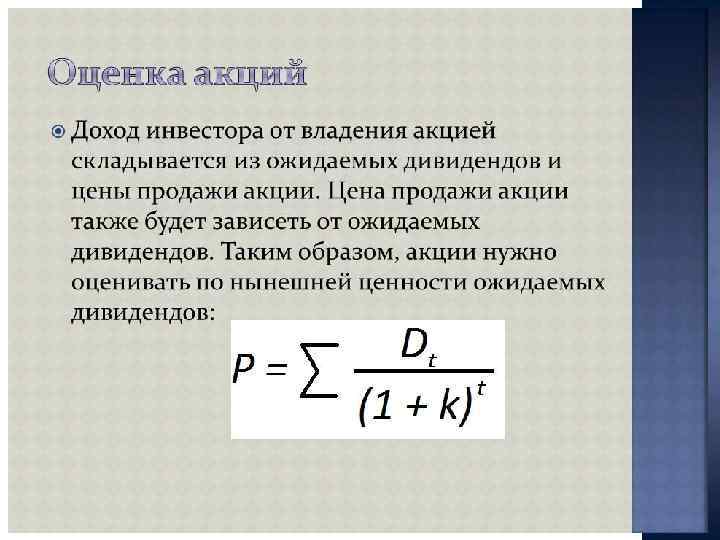 Доход инвестора по акции: дивиденды курсовой доход (разница между ценой продажи и ценой покупки) Доход инвестора по облигации: проценты дисконт (разница между номинальной стоимостью и ценой покупки) курсовой доход (разница между ценой продажи и ценой покупки)