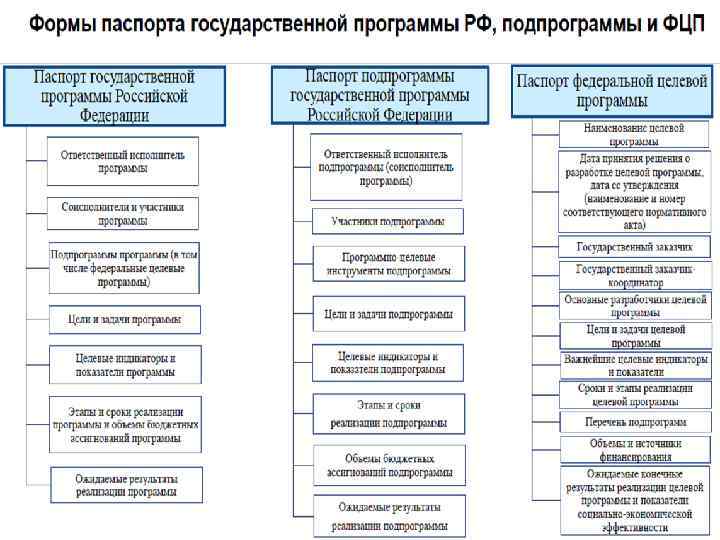 Государственная программа содержит: а) паспорт государственной программы по форме; б) паспорта подпрограмм по форме; в) паспорта федеральных целевых программ по форме; г) приоритеты и цели государственной политики …. ; д) перечень и характеристики основных мероприятий ……. ; е) основные меры правового регулирования в соответствующей сфере …. . ; ж) перечень целевых индикаторов и показателей; з) информацию по финансовому обеспечению……; и) предельные объемы средств федерального бюджета ……. ; к) правила предоставления субсидий из федерального бюджета …. . ; л) план реализации государственной программы.