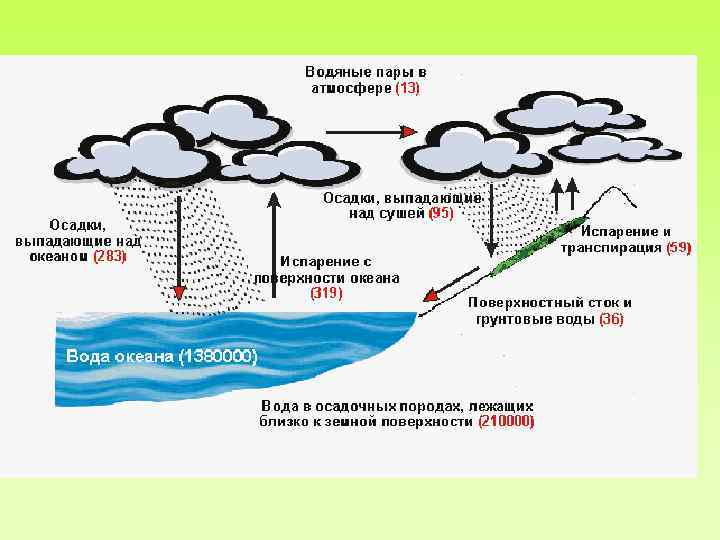 Механизмы круговоротов воды: Малый круговорот • Испарение воды с поверхности океана, конденсация пара в атмосфере и выпадение осадков на поверхность океана • Цель: самоочищение воды • Регуляция водного режима, поддержание климата над океаном. Большой круговорот • Испарение воды, конденсация пара, выпадение осадков над сушей и попадание их в грунтовые воды, возвращение обратно через реки и озера в океан. При этом часть осадков испаряется и поступает обратно в атмосферу. . • Цель: распределение веществ и энергии между сушей и морем. Регуляция водного режима и климата надо сушей и морем.