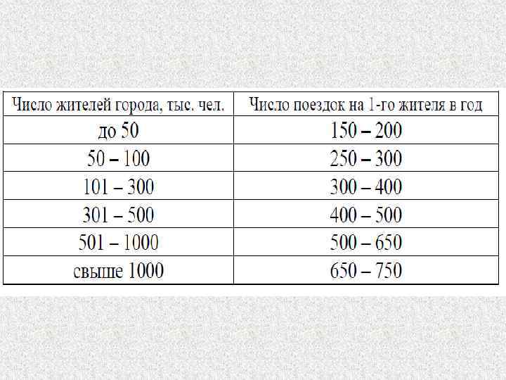 В таблице приведены данные Научноисследовательского института автомобильного транспорта (НИИАТa) о соотношении транспортной подвижности населения с учетом всех видов транспорта с численностью жителей населенного пункта.