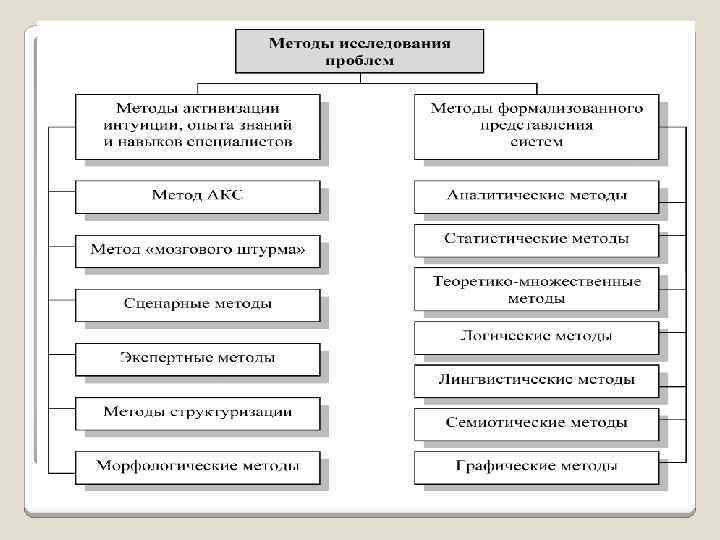 V. По направлению исследований: методы анализа, прогнозирования, синтеза и др. VI. В зависимости от их связи с характером проблемы: для исследования неструктуризированных проблем применяют экспертные методы; для исследования слабоструктуризированных проблем – методы системного анализа и синтеза; для исследования структуризированных проблем – формализованные методы. В системном анализе используется комбинация различных методов. В общем виде классификация методов исследования проблем представлена на рисунке
