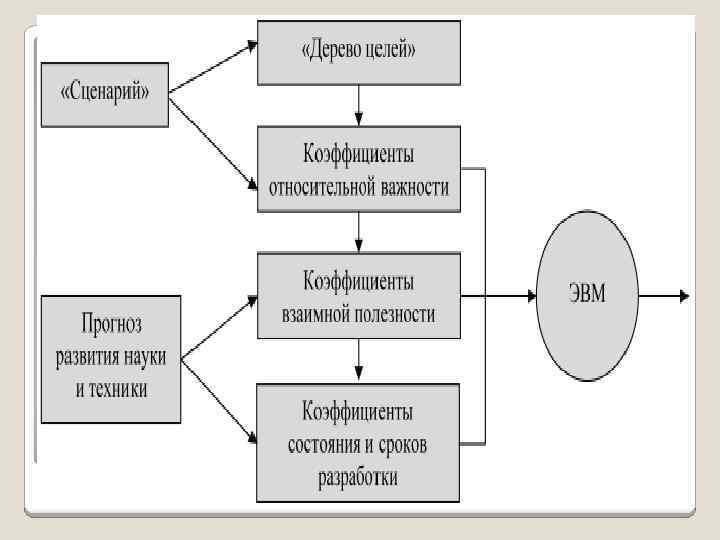 VI. Выявление ресурсов и процессов, композиция целей осуществляется традиционным путем, начиная с анализа существующего положения, достигнутого уровня и последовательного прогноза. При этом используются методы экспертных оценок, деревьев целей, прогнозных расчетов и др. VII. Прогнозирование и анализ условий развития объекта-системы начинается с оценки влияния различных факторов как внутри системы, так и внешнего воздействия. Анализируются возможные варианты изменения целей и тенденций развития системы, состояние ресурсного обеспечения будущего развития, делается прогноз и анализ будущих условий. Для этого используются методы сценариев, экспертных оценок, деревьев целей, статистические, описательные модели и др.