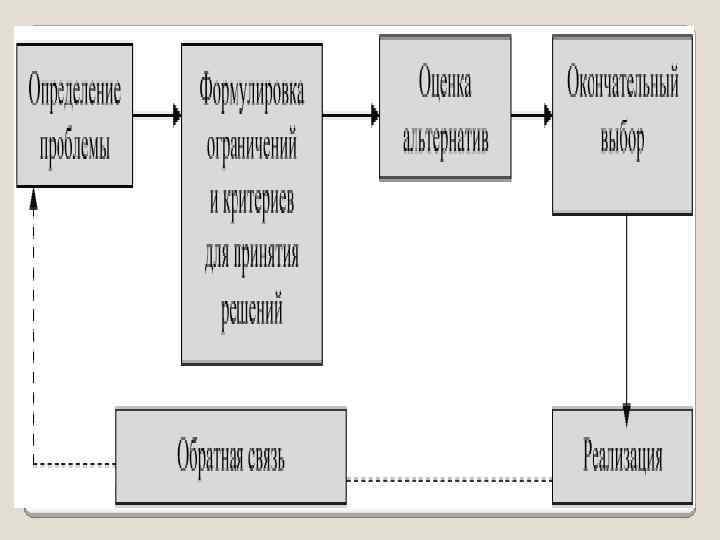 Обратная связь – это функция подсистемы, сравнивающей выход с критерием (с целью управления процессом). Как было отмечено ранее, любая система состоит из подсистем и ее граница определяется совокупностью входов от внешней среды. В свою очередь системы помогают разрешить какие - либо проблемы, возникающие в процессе исследования. Выявление проблемных ситуаций – это и есть проблема принятия решений. Принятие решения должно завершиться конкретными результатами и разбивается на ряд обязательных этапов: определение цели исследования и критерия ее достижения; формулировка конкретных задач; выбор способов, приемов, методов и средств для решения поставленных задач. Так, процесс рационального решения проблем можно представить в виде следующей схемы: