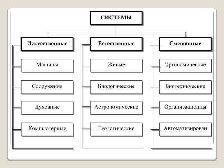 ГРУППЫ СИСТЕМ: ЕСТЕСТВЕННЫЕ, ИСКУССТВЕННЫЕ И СМЕШАННЫЕ Причины образования (происхождения) системы зависят от надсистемной структуры, поскольку именно она определяет целесообразность создания (возникновения) данной системы. В качестве навигатора в предметной области системного анализа служит классификация систем. Если в основу классификации принять отношение системы к человеку, то можно выделить следующие группы систем: естественные, искусственные и смешанные
