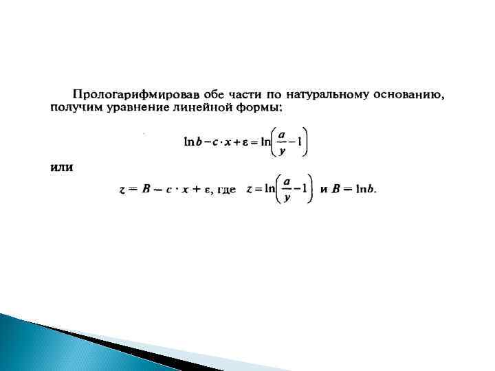 В этом плане к линейным экспоненциальную модель относят, например, y = еa+bхε, т. к. логарифмируя ее по натуральному основанию, получим линейную форму модели lnу = а + b х +lnε.