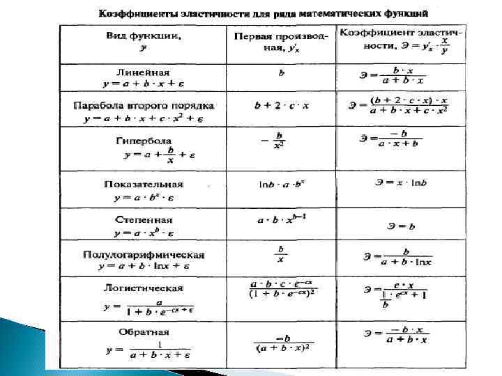 Формулы для расчета среднего коэффициента эластичности Вид функции, Средний коэффициент эластичности,