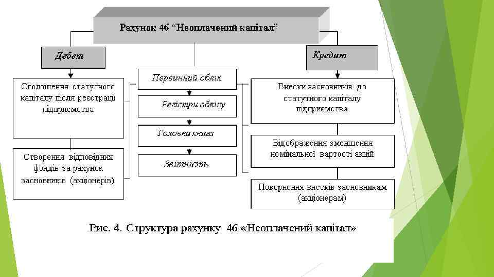 Формування статутного капіталу та його руху № Зміст г/о 1 Зареєстровано статут (зміни до статуту) товариства 2 Здійснено внески до статутного капіталу: Дебет Кредит 46 401 - грошовими коштами 30, 31 46 - основними засобами 10 46 12 46 інтелектуальною власністю та іншими нематеріальними активами - цінними паперами інших суб’єктів господарювання 14 46 - матеріальними цінностями 20, 22 46 3 Збільшення статутного капіталу за рахунок: - нерозподіленого прибутку 443 46 - належних учасникам дивідендів 671 401