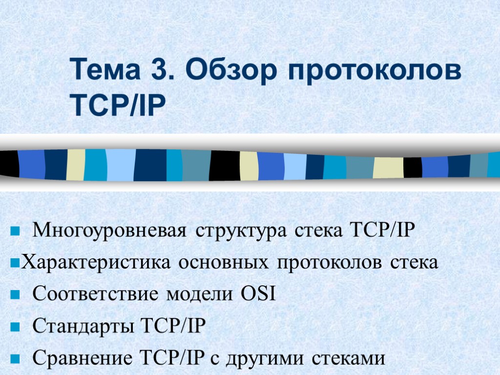 Тема 3. Обзор протоколов TCP/IP Многоуровневая структура стека TCP/IP Характеристика основных протоколов стека Соответствие модели OSI Стандарты TCP/IP Сравнение TCP/IP с другими стеками