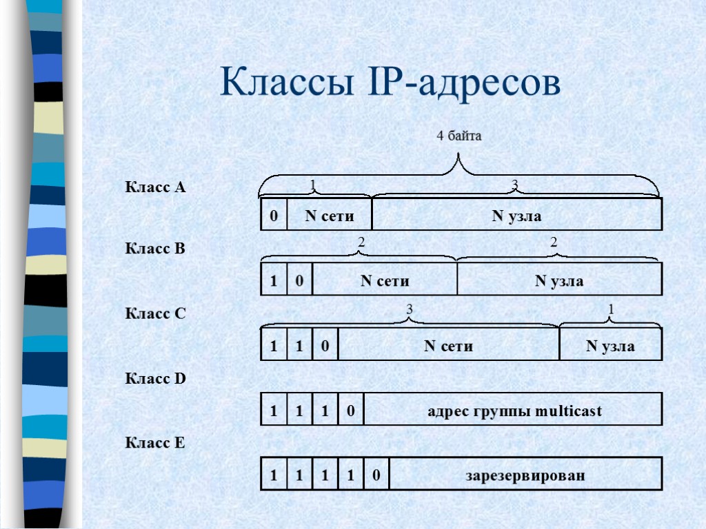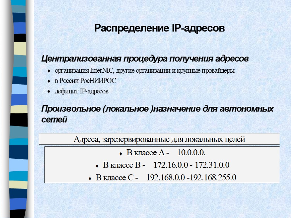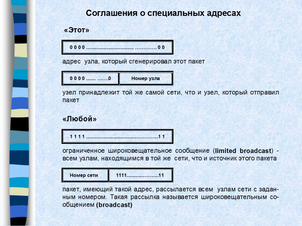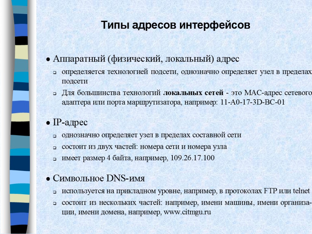 Типы IP-адресов: Unicast (адресует отдельный сетевой интерфейс) Broadcast (адресует все интерфейсы заданной подсети) Multicast (адресует группу интерфейсов, возможно принадлежащих разным подсетям)