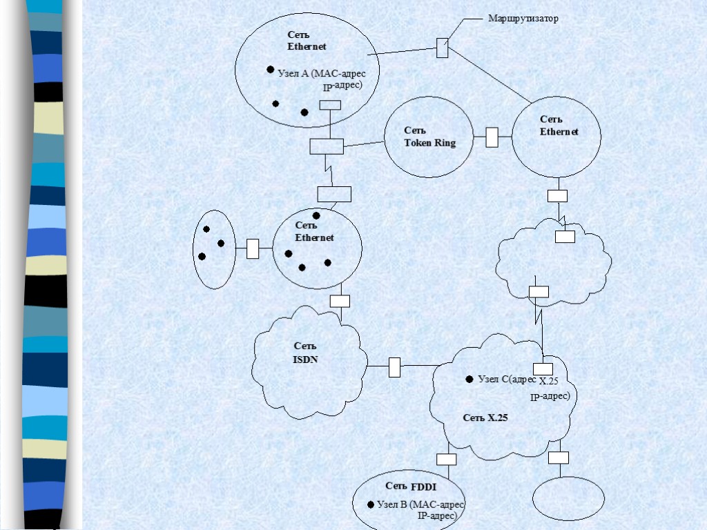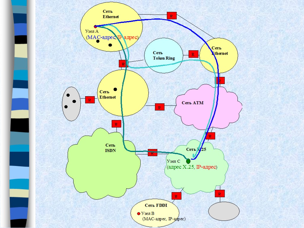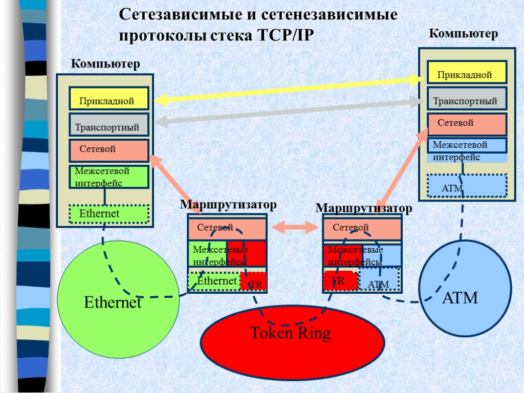 Прикладной Транспортный Прикладной Транспортный TR ATM ATM ATM Token Ring Ethernet Межсетевые интерфейсы Межсетевые интерфейсы Сетезависимые и сетенезависимые протоколы стека TCP/IP Компьютер Компьютер Маршрутизатор Маршрутизатор