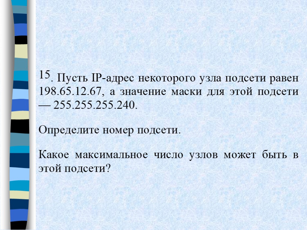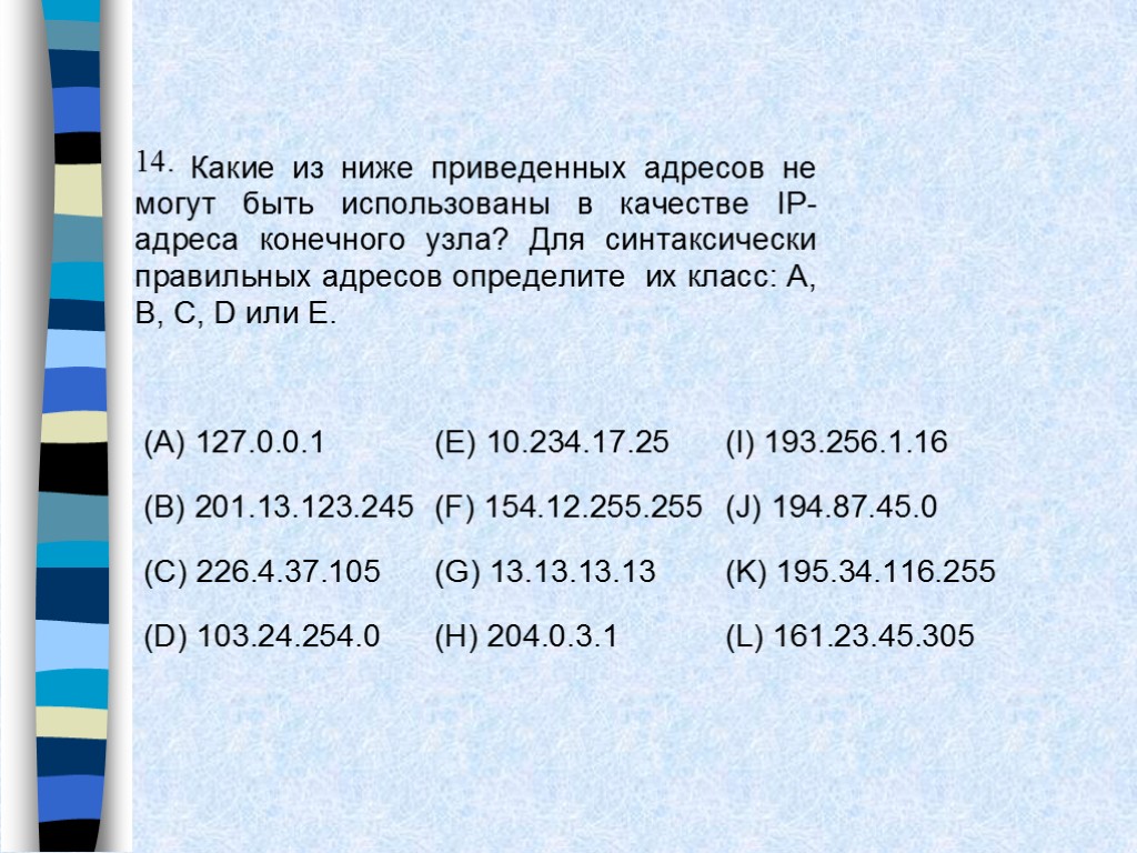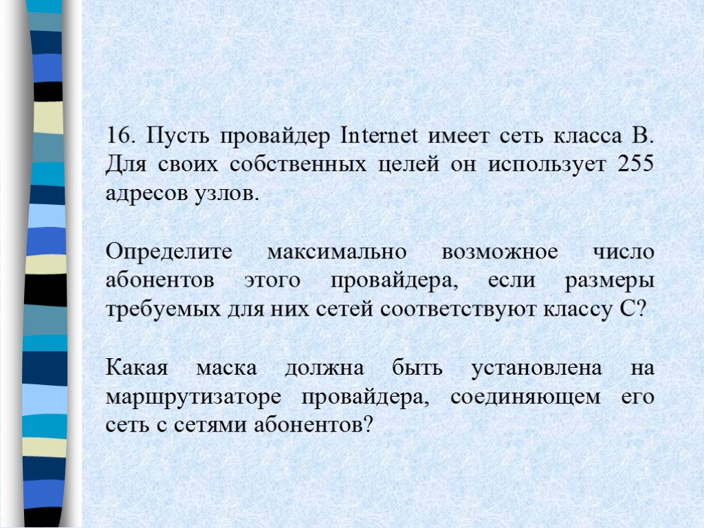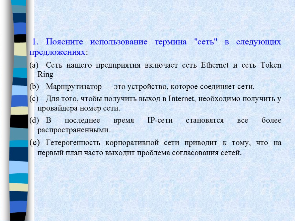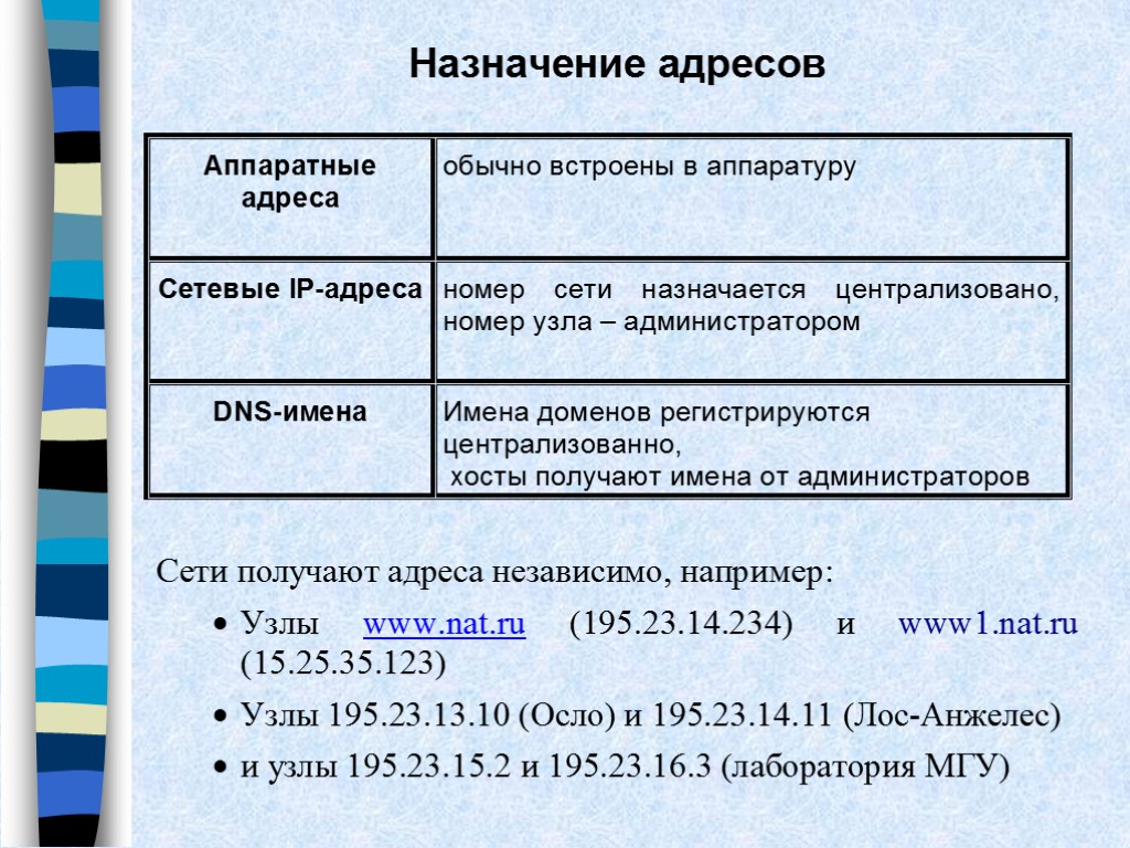 Адреса: сетевых интерфейсов (сетевых адаптеров, портов маршрутизаторов) Коммутаторы, мосты и концентраторы прозрачны для IP-сети и поэтому их порты не имеют IP-адресов 2) приложений (пользовательских программ и системных средств)