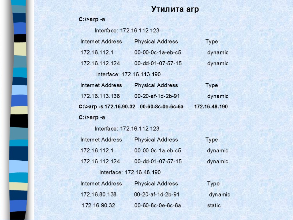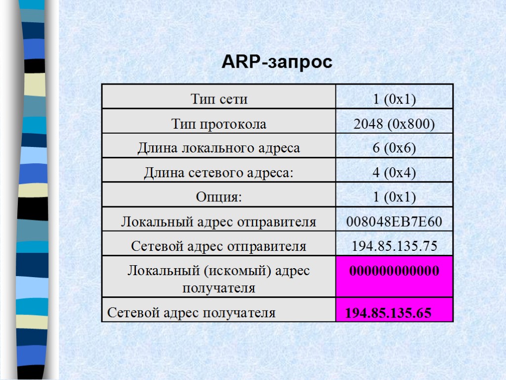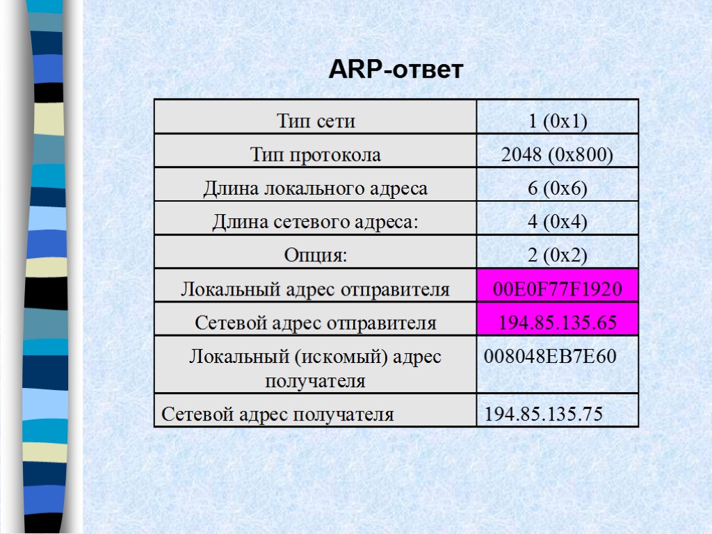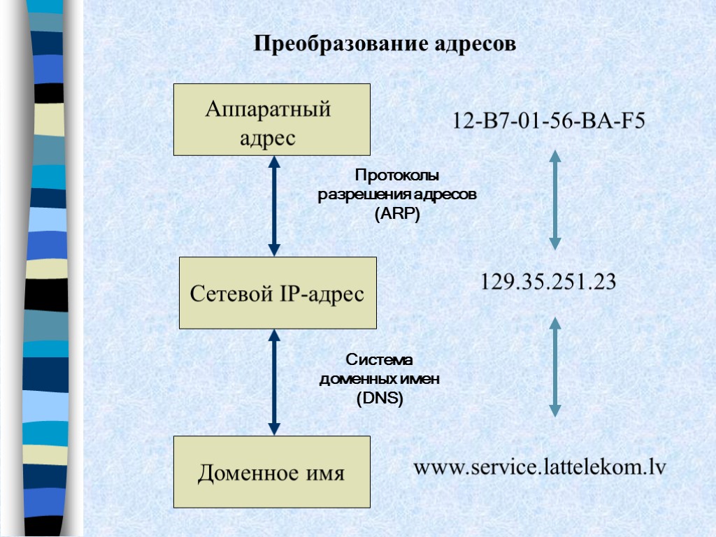 Преобразование адресов Аппаратный адрес Сетевой IP-адрес Доменное имя Протоколы разрешения адресов (ARP) 12-B7-01-56-BA-F5 129.35.251.23 Система доменных имен (DNS) www.service.lattelekom.lv