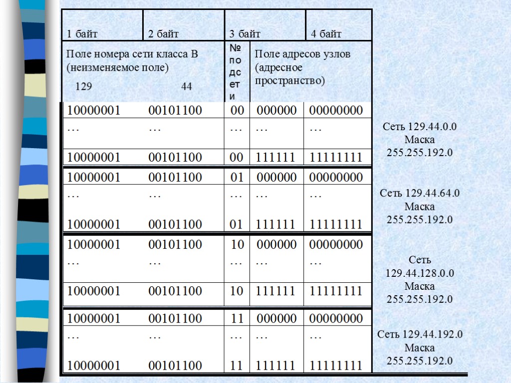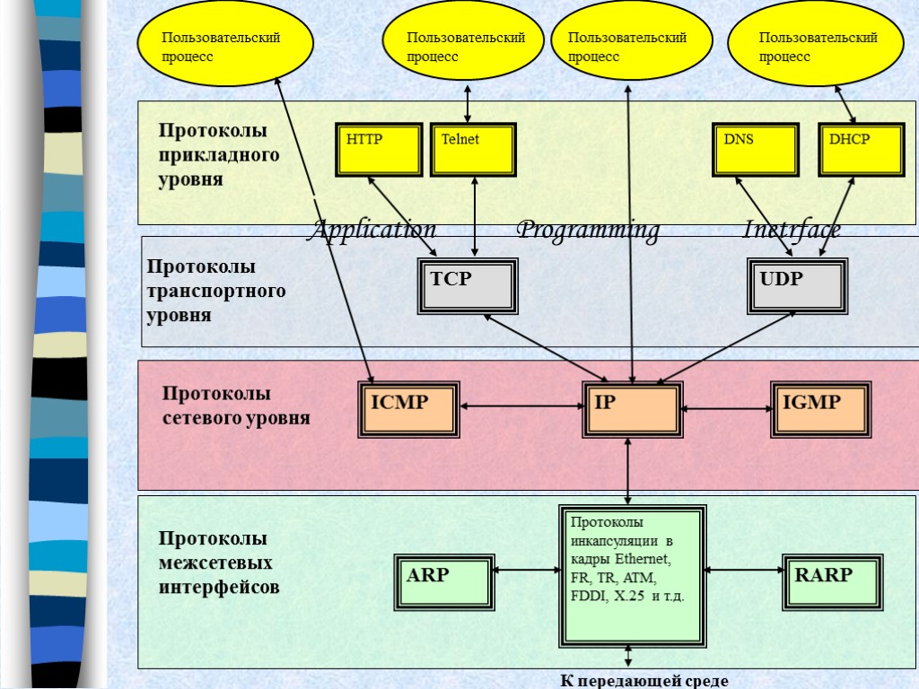 К передающей среде Протоколы межсетевых интерфейсов RARP Протоколы инкапсуляции в кадры Ethernet, FR, TR, ATM, FDDI, X.25 и т.д. ARP TCP UDP Протоколы транспортного уровня IGMP IP ICMP HTTP Протоколы прикладного уровня Telnet DHCP DNS Пользовательский процесс Пользовательский процесс Пользовательский процесс Пользовательский процесс Протоколы сетевого уровня Application Programming Inetrface