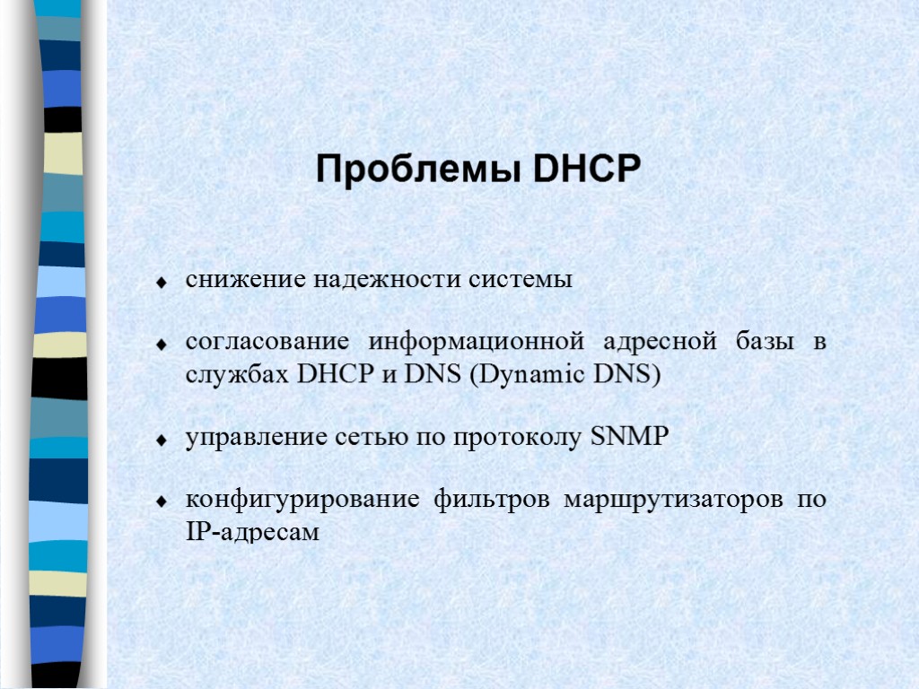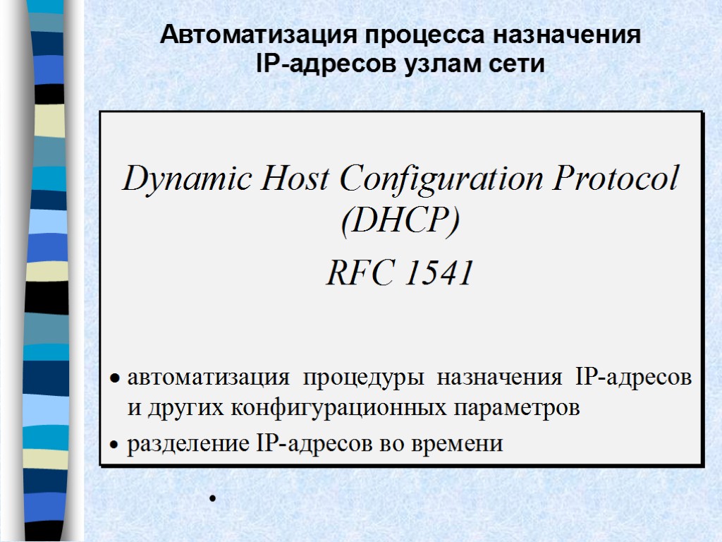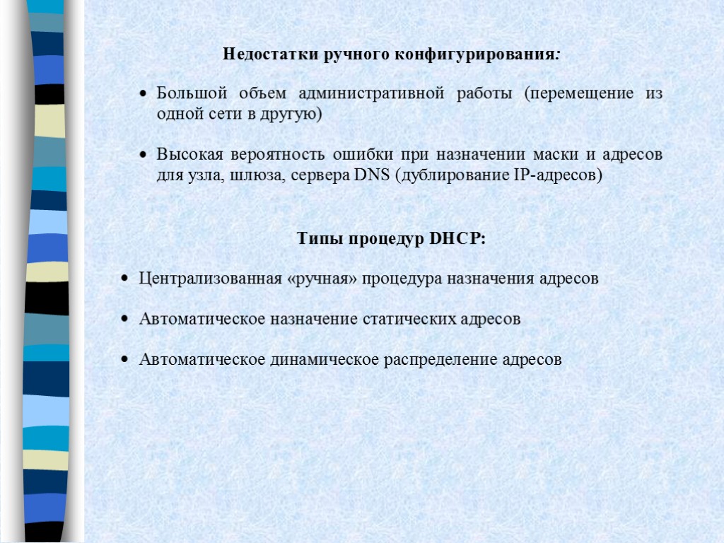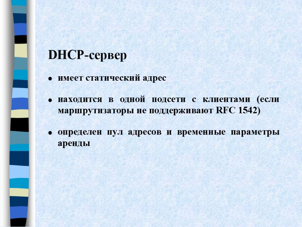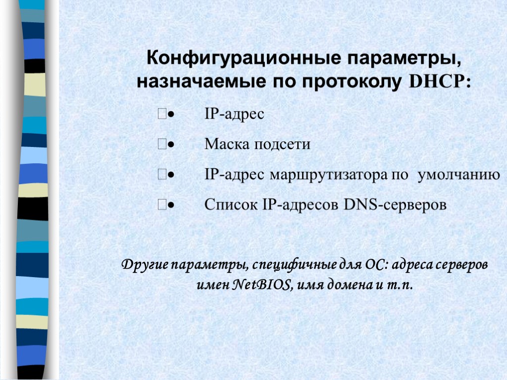 Конфигурационные параметры, назначаемые по протоколу DHCP: · IP-адрес · Маска подсети · IP-адрес маршрутизатора по умолчанию · Список IP-адресов DNS-серверов Другие параметры, специфичные для ОС: адреса серверов имен NetBIOS, имя домена и т.п.
