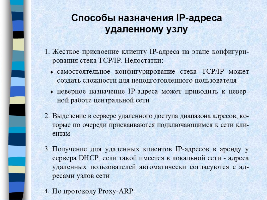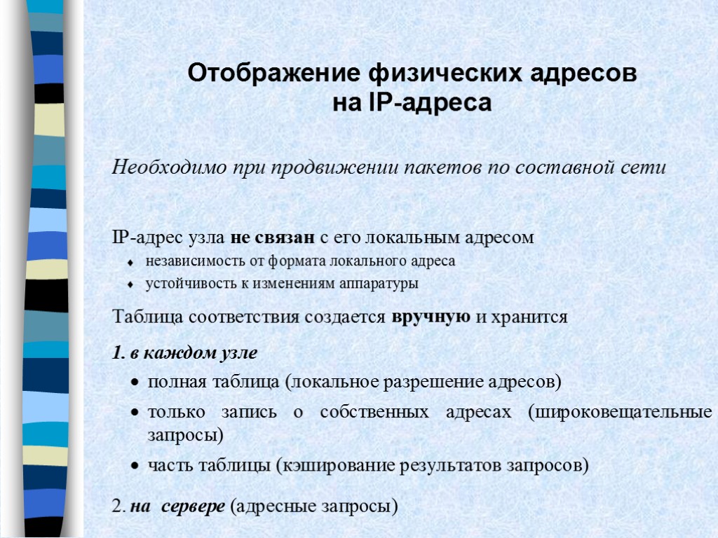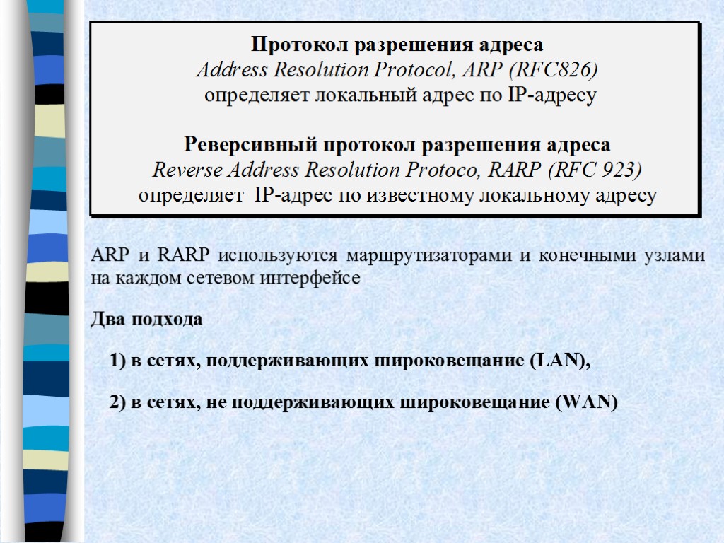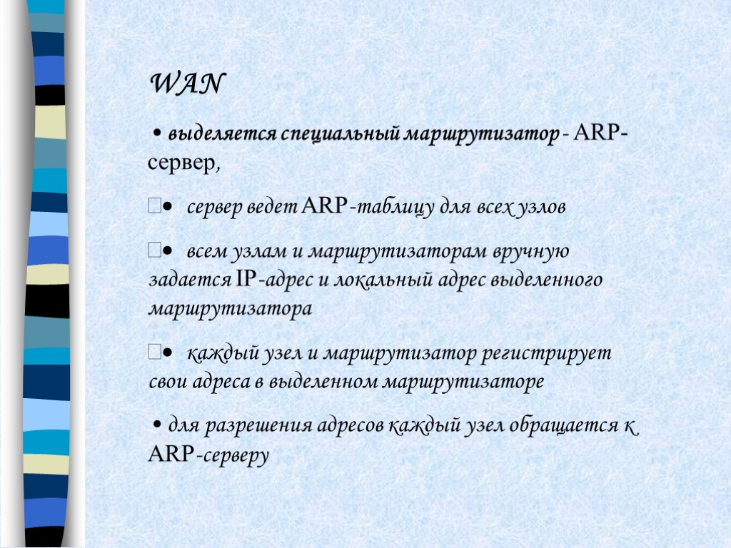 WAN выделяется специальный маршрутизатор - ARP-сервер, · сервер ведет ARP-таблицу для всех узлов · всем узлам и маршрутизаторам вручную задается IP-адрес и локальный адрес выделенного маршрутизатора · каждый узел и маршрутизатор регистрирует свои адреса в выделенном маршрутизаторе для разрешения адресов каждый узел обращается к ARP-серверу