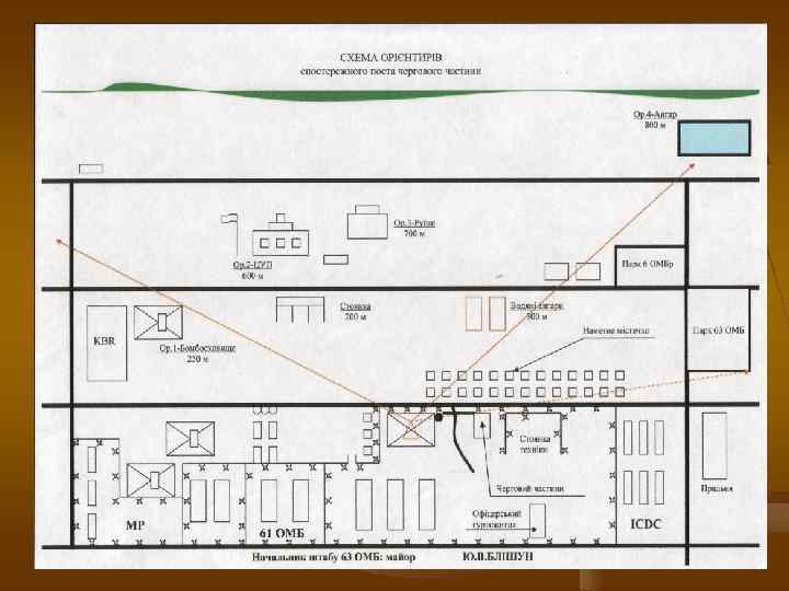 Документи з розвідки, які ведуться в батареї n n n На кожному спостережному пункті складається схема орієнтирів і ведеться журнал розвідки і обслуговування стрільби. На командно-спостережному пункті, крім того, ведуться робоча карта, великомасштабний планшет і схема цілей. Під час організації розвідки на сильно пересіченій місцевості і в горах при наявності достатнього часу на спостережних пунктах складають схеми полів, що не спостерігаються.