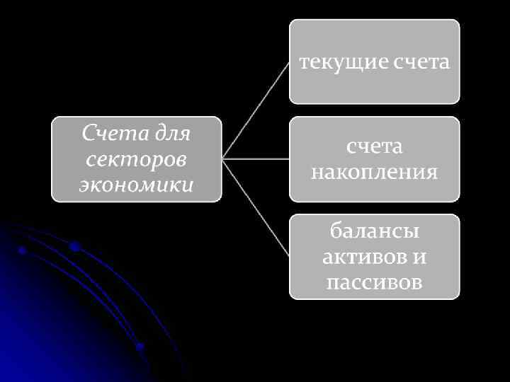Счета Балансирующая статья Счета «остального мира» (счета внешних операций) 1. Счет внешних операций с товарами Сальдо внешних операций с товарами и услугами 2. Счет внешних первичных доходов и текущих трансфертов 3. Счета накоплений по внешним операциям. 3. 1. Счет операций с капиталом 3. 2. Финансовый счет 3. 3. счета др. изменений в активах Сальдо по текущим внешним операциям Чистое кредитование (+) / чистое заимствование (-) Изменения чистой стоимости капитала, обусловленные др. изменениями в активах 4. Балансы активов и пассивов 4. 1. Начальный баланс активов и пассивов 4. 2. Изменения в балансе активов и пассивов 4. 3. Заключительный баланс активов и пассивов Чистая стоимость капитала Изменения в чистой стоимости капитала Чистая стоимость капитала
