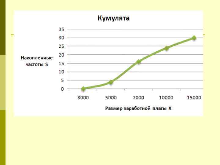 Графическое изображение вариацио ряда p Полигон распределения. p Гистограмма – столбиковая диаграмма, для построения которой на оси абсцисс откладывают отрезки, равные величине интервалов вариационного ряда. p Кумулята распределения строится по накопленным частотам (частостям). Накопленные частоты (частости) определяются последовательным суммированием частот (частостей).