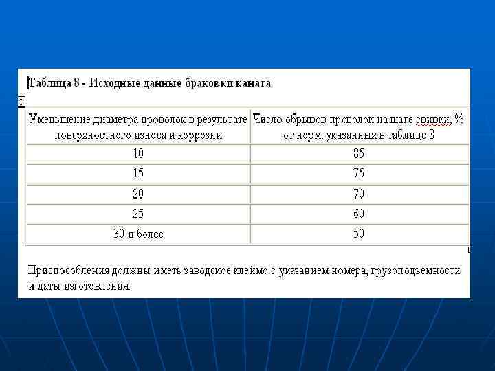 Применять, подбирать и выбраковывать грузозахватные приспособления, стальные канаты, стропы, чалки следует в соответствии с действующими «Правилами устройства и безопасной эксплуатации грузоподъемных кранов» Госгортехнадзора России выписка из которых представлена в таблице 7.