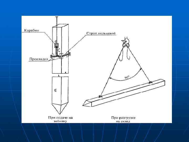 ТРЕБОВАНИЯ БЕЗОПАСНОСТИ ВО ВРЕМЯ РАБОТЫ (при установке свай) Подъем свай, находящихся в горизонтальном положении, должен производиться в соответствии с технологической картой. При подъеме свай, находящихся в горизонтальном положении, при всех условиях должно быть обеспечено вертикальное положение полиспастов грузоподъемного крюка копра (крана). Сваи разрешается подтягивать по прямой линии в пределах видимости машиниста копра только через отводной блок, закрепляемый у основания копра. Запрещается подтягивать сваю через верхний блок копра, а также сваю, расположенную сбоку, а при выведении сваи в вертикальное положение строповка производится за кольцевой строп согласно рисунку 9.