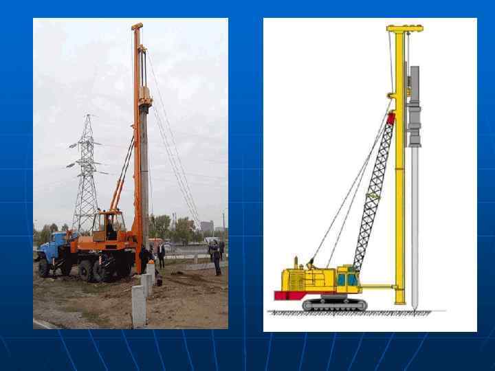 Способы погружения забивных свай. Из всех перечисленных видов свай, в массовом строительстве зданий различного назначения при устройстве свайного поля фундамента в основном используются забивные сваи квадратного или круглого сечения Погружение забивных свай осуществляется одним из следующих способов: Ударный (забивной) способ погружения Наиболее распространенный на сегодняшний момент способ, используется при устройстве свайного поля на любых грунтах, за исключением скальных. Для ударного погружения свай используют сваебойный копер (сваебой) - специализированную машину на базе существующих или специализированных самоходных шасси (кранов, бульдозеров, автомобилей) и стационарных установок башенного типа, рабочий инструмент копра - молот. Молоты выпускаются двух основных типов - гидравлический молот и дизельный молот (дизель-молот) в двух вариантах исполнения: съемном и несъемном. Дизель-молоты существуют двух видов - трубчатый дизель -молот и штанговый дизель-молот.
