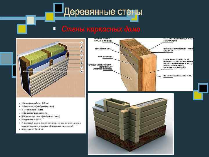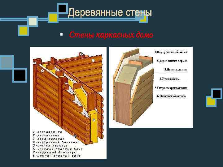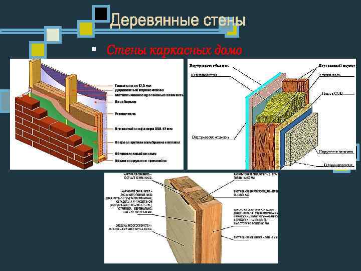 § Деревянный каркас малоэтажных зданий выполняется из ряда стоек, объединяемых в жесткую пространственную систему. § Каркас обшивается, а внутренняя полость заполняется утеплителем. За внутренней обшивкой прокладывается пароизоляция. Каркас пропитывается огнезащитным и биологическим составом.